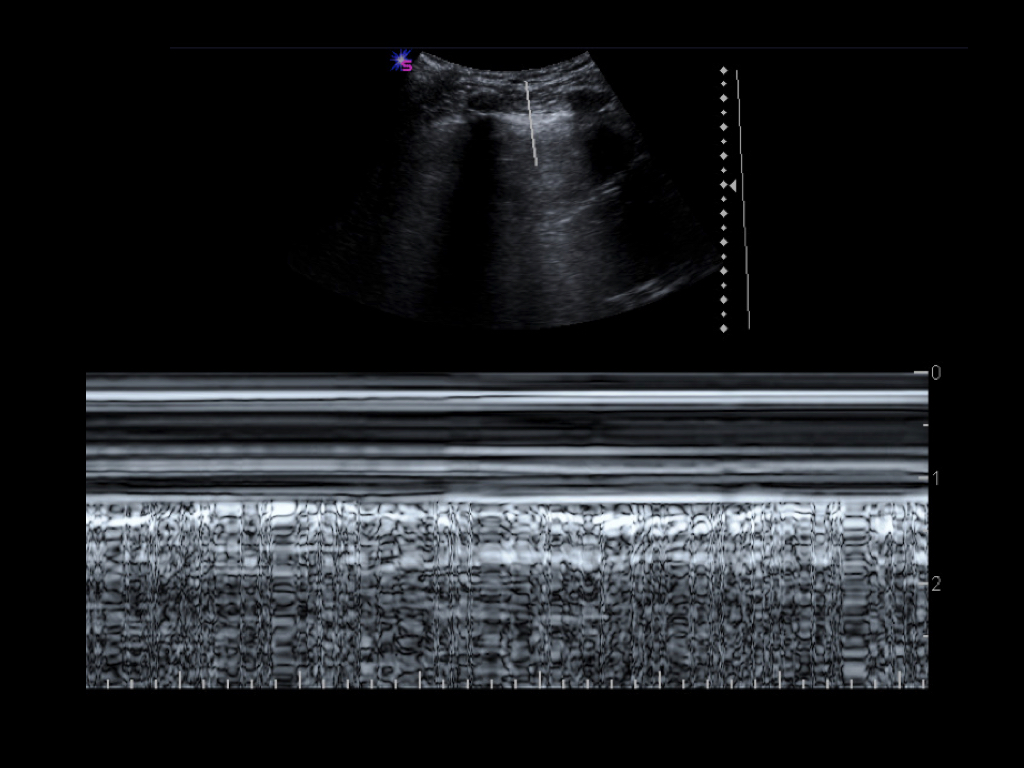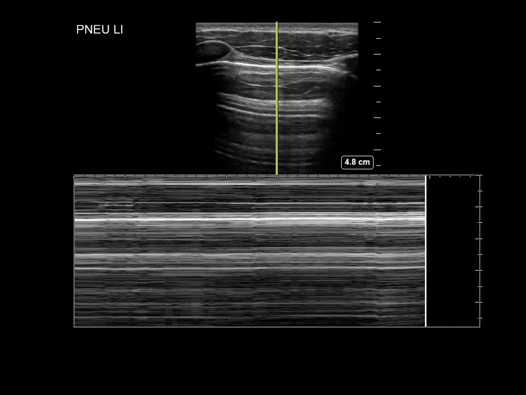 - Im M-Mode: ein Strahl wird durch das subkutane Gewebe, die Interkostalmuskulatur, Pleura und Lunge gelegt. Bei normalen Verhältnissen entsteht unterhalb der Pleuralinie ein granuliertes Muster, während im Bereich der Cutis, Subcutis und Interkostalmuskulatur ein lineares Muster entsteht („Seashore-Sign“). Bei Vorliegen eines Pneumothorax ist aufgrund der fehlenden Bewegung im Bereich der Pleuralinie ein durchgehend lineares Muster zu beobachten („Barcode-Sign“).