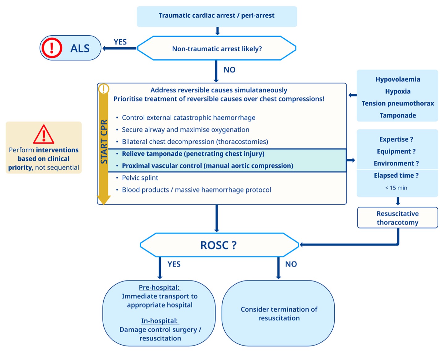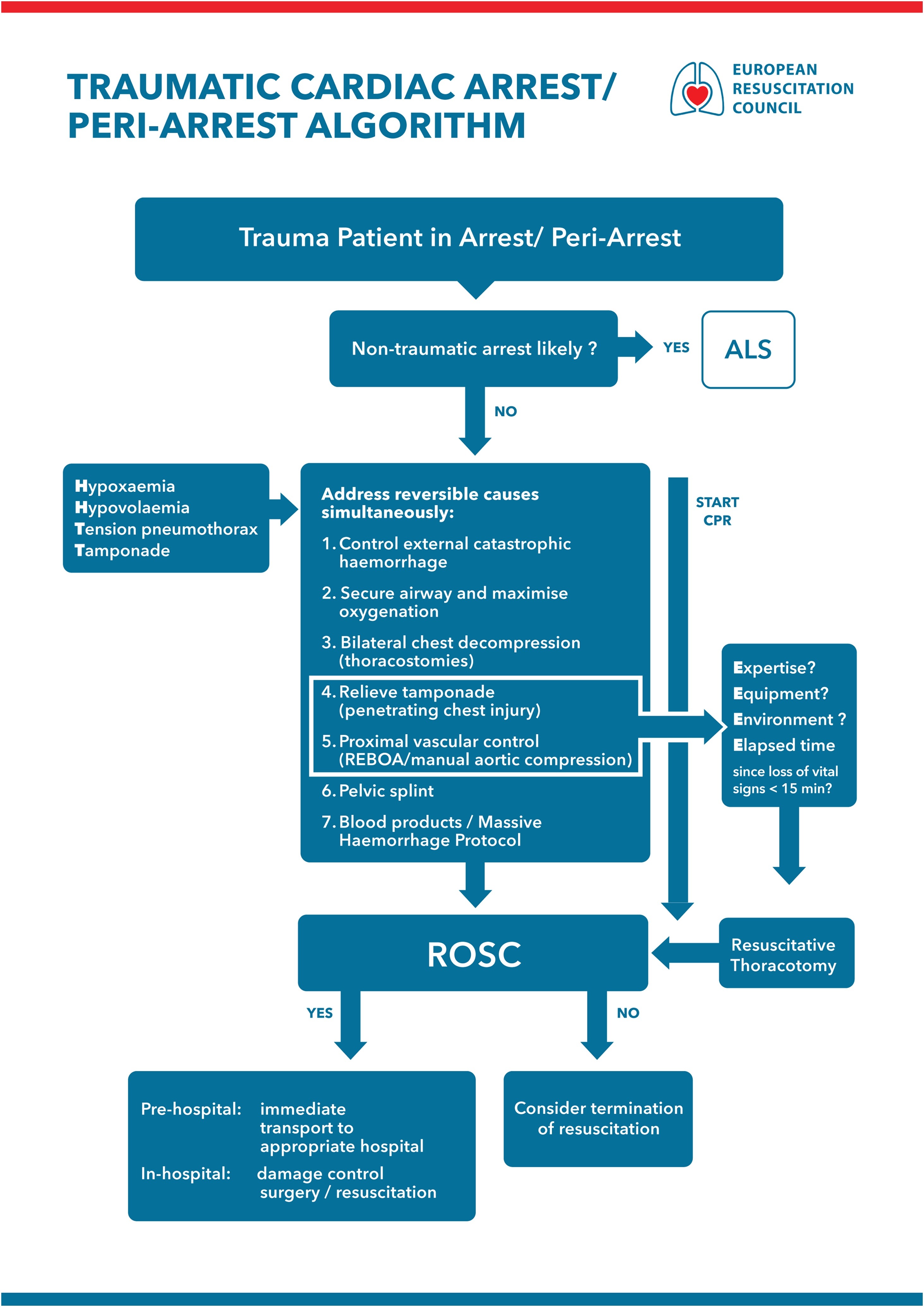 Die neue Richtlinie betont auch, dass das Durchführen von bestimmten Interventionen vor Ort sich vielmehr nach dem System und dem Team, das vor Ort ist, richtet. Eine frühe Voralarmierung eines geeigneten Traumazentrums sowie die Alarmierung eines „Code Red“ oder Äquivalents werden empfohlen. Systeme, in welchen die Behebung reversibler Ursachen nicht möglich sind, sollen unter Advanced-Life-Support oder Basic-Life-Support Maßnahmen einen schnellen Transport in ein geeignetes Krankenhaus priorisieren.